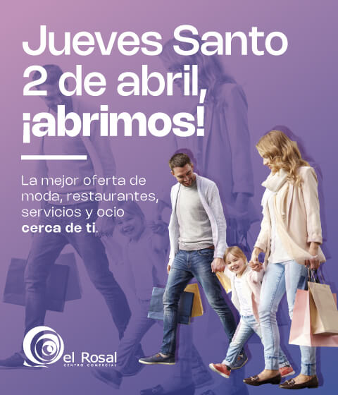 Este Jueves Santo disfruta de tus compras en El Rosal, todas nuestras tiendas están abiertas para ti de 10h a 22h y restauración hasta las 0:00h. Ven y pasa un día de ocio y compras con tu familia y amigos en el centro comercial.